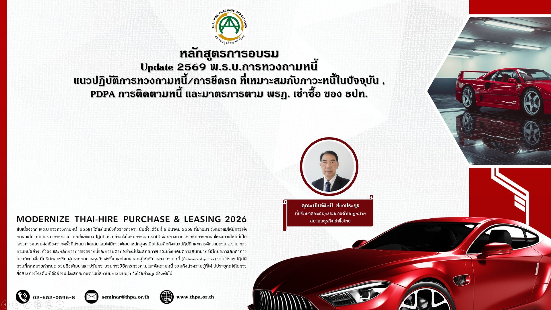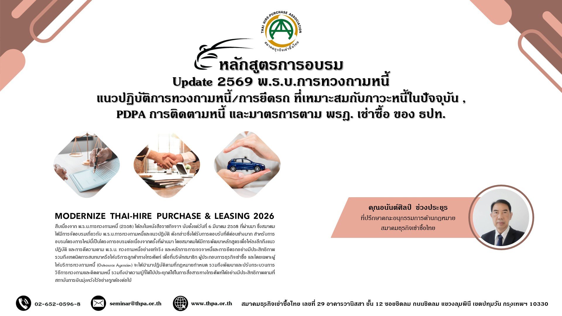 Update 2569 พ.ร.บ.การทวงถามหนี้ แนวปฏิบัติการทวงถามหนี้/การยึดรถ ที่เหมาะสมกับภาวะหนี้ในปัจจุบัน , PDPA การติดตามหนี้ และมาตรการตาม พรฎ. เช่าซื้อ ของ ธปท.