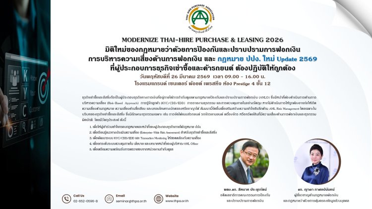 การบริหารความเสี่ยงด้านการฟอกเงิน และ กฎหมาย ปปง. ใหม่ Update 2569 ที่ผู้ประกอบการธุรกิจเช่าซื้อและค้ารถยนต์ ต้องปฎิบัติให้ถูกต้อง (พร้อม WORKSHOP : AML Risk Management)